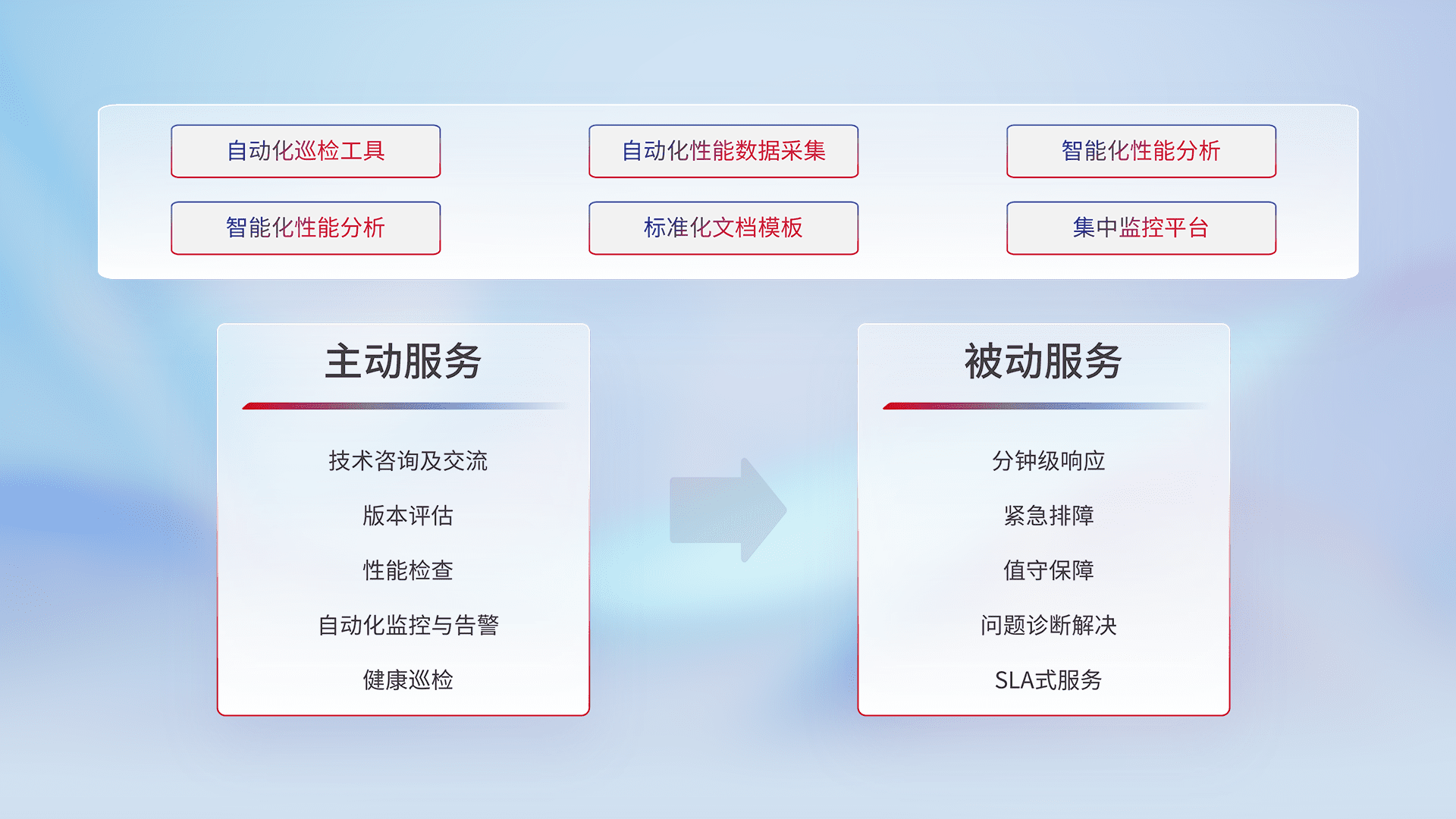 智能化工具和标准化文档,,,,保障服务质量,,,,提供主动服务(包含技术咨询、、版本评估、、、性能检查、、自动化监控与告警、、、、健康巡检)和被动服务包含(分钟级响应、、紧急排障、、、、值守保障、、问题诊断解决、、、SLA服务)。。。。